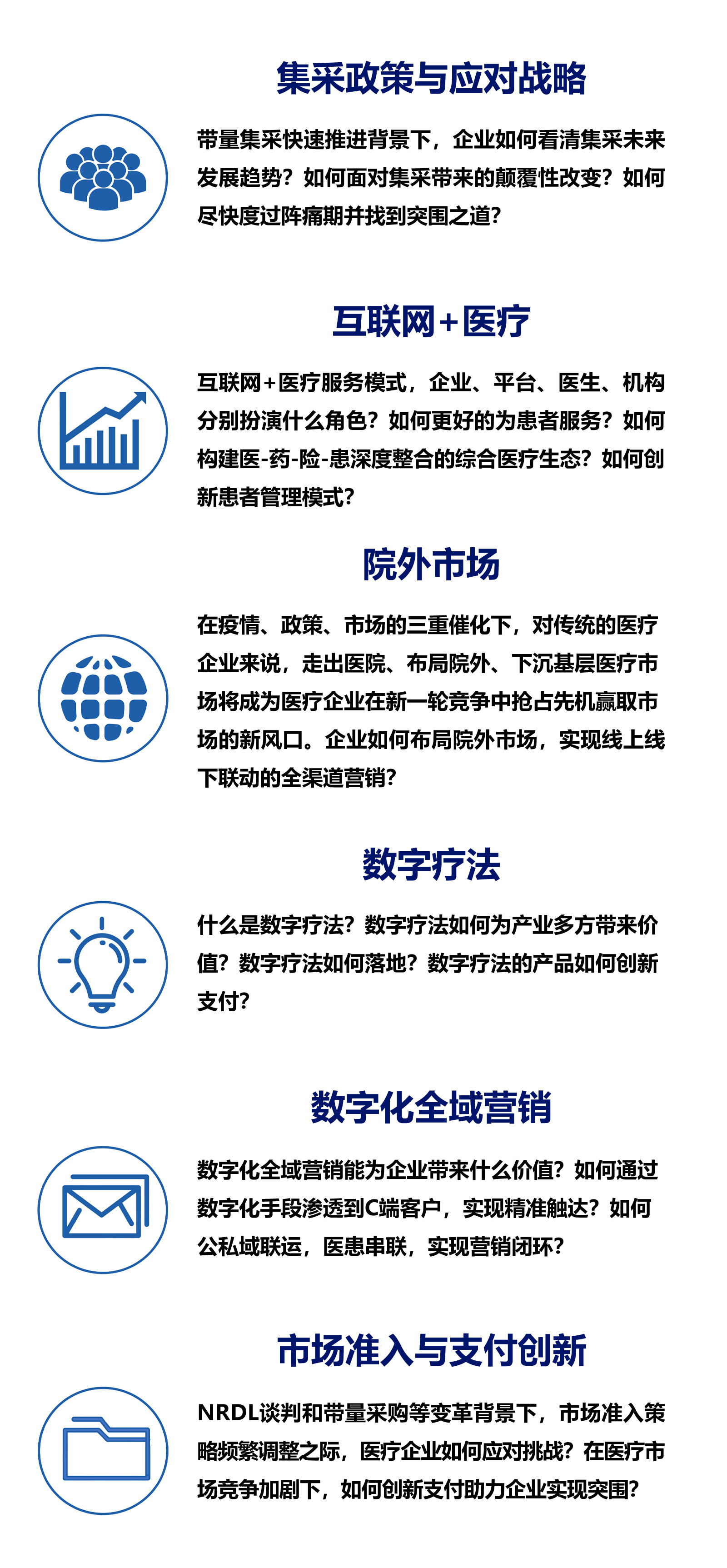 本次大會(huì)將深度解析集采加速下,醫(yī)療企業(yè)如何應(yīng)對;如何踐行院內(nèi)院外雙通道戰(zhàn)略;如何借力技術(shù)創(chuàng)新,發(fā)力互聯(lián)網(wǎng)醫(yī)療,營銷創(chuàng)新和支付創(chuàng)新,助力企業(yè)在激烈的市場競爭中實(shí)現(xiàn)突圍。