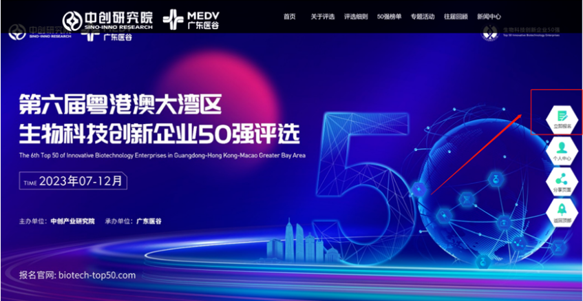 登錄粵港澳大灣區(qū)生物技術(shù)創(chuàng)新企業(yè)50強(qiáng)評選活動官方網(wǎng)站http://www.biotech-top50.com/,點(diǎn)擊“立即報名”;報名截止時間為2023年10月31日。