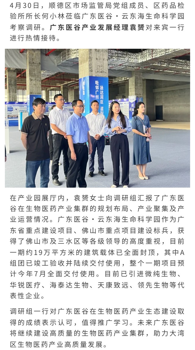順德區(qū)市場監(jiān)管局黨組成員、區(qū)藥品檢驗所所長何小林一行蒞臨廣東醫(yī)谷考察調(diào)研