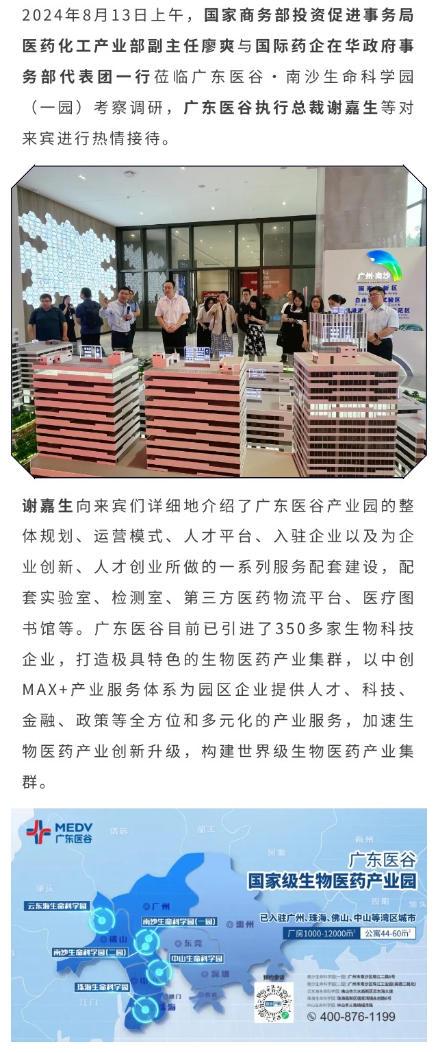 商務(wù)部投資促進(jìn)事務(wù)局及國際藥企在華政府事務(wù)部代表團(tuán)一行蒞臨廣東醫(yī)谷考察調(diào)研