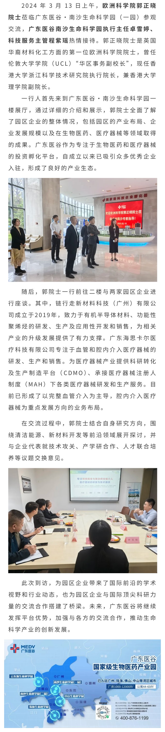 歐洲科學院郭正曉院士蒞臨廣東醫(yī)谷參觀交流