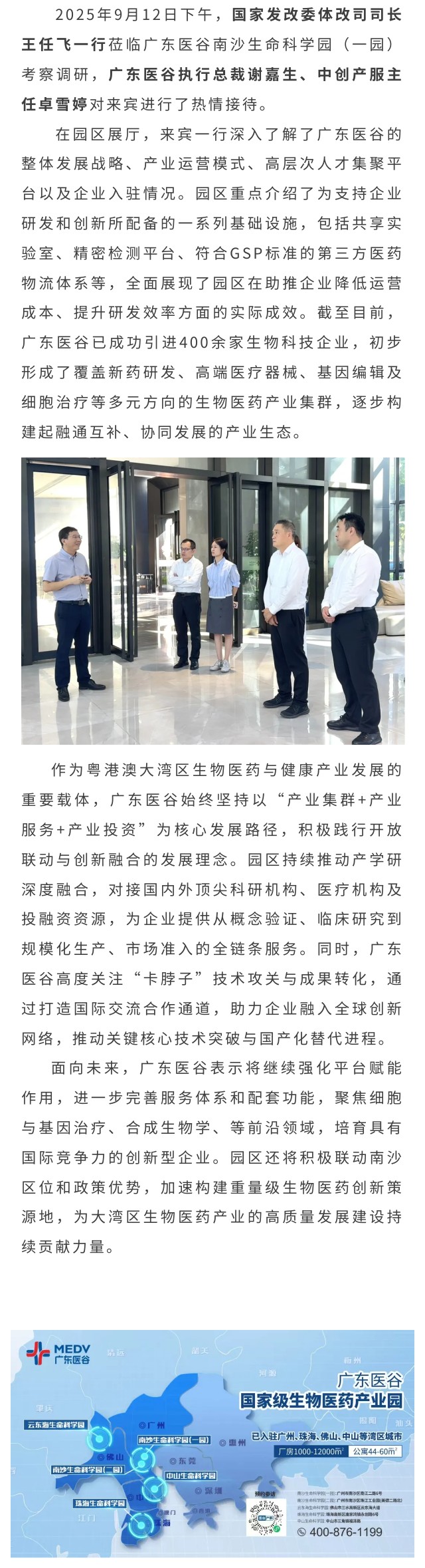 國家發(fā)改委體改司司長王任飛一行蒞臨廣東醫(yī)谷考察調研