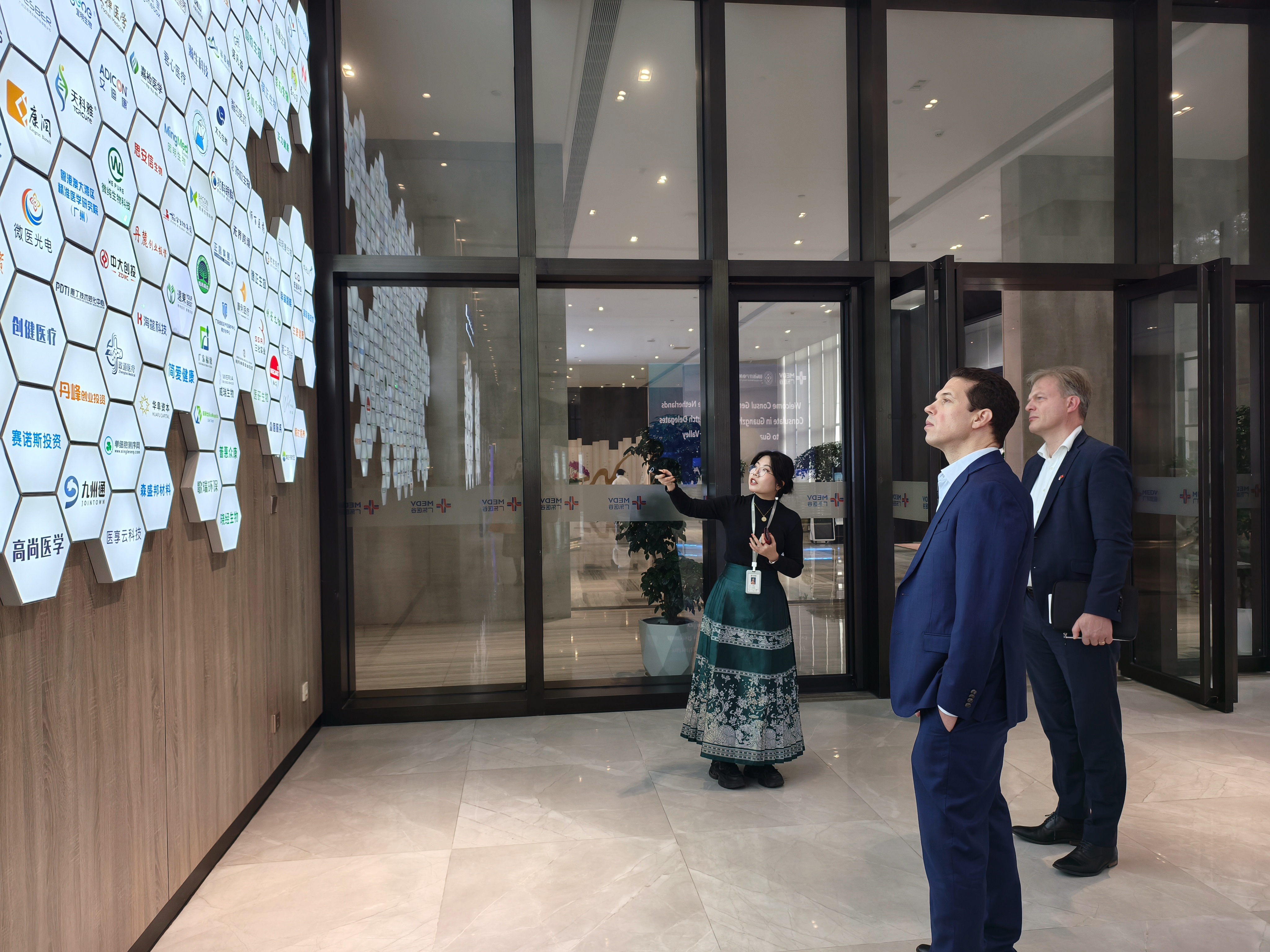 來(lái)賓一行實(shí)地考察了產(chǎn)業(yè)發(fā)展展廳,了解廣東醫(yī)谷的整體規(guī)劃、運(yùn)營(yíng)模式、產(chǎn)業(yè)服務(wù)平臺(tái)、入駐企業(yè)和國(guó)際合作情況。廣東醫(yī)谷一向重視國(guó)際合作,目前已通過(guò)國(guó)際醫(yī)療產(chǎn)業(yè)創(chuàng)新中心與全球超30個(gè)國(guó)家及地區(qū)建立了廣泛聯(lián)系。其中,與荷蘭的合作淵源深厚——自2016年以來(lái),雙方已開(kāi)展十余次交流合作,并成功協(xié)助20多家荷蘭醫(yī)療企業(yè)對(duì)接超過(guò)40家中方企業(yè)與機(jī)構(gòu)。