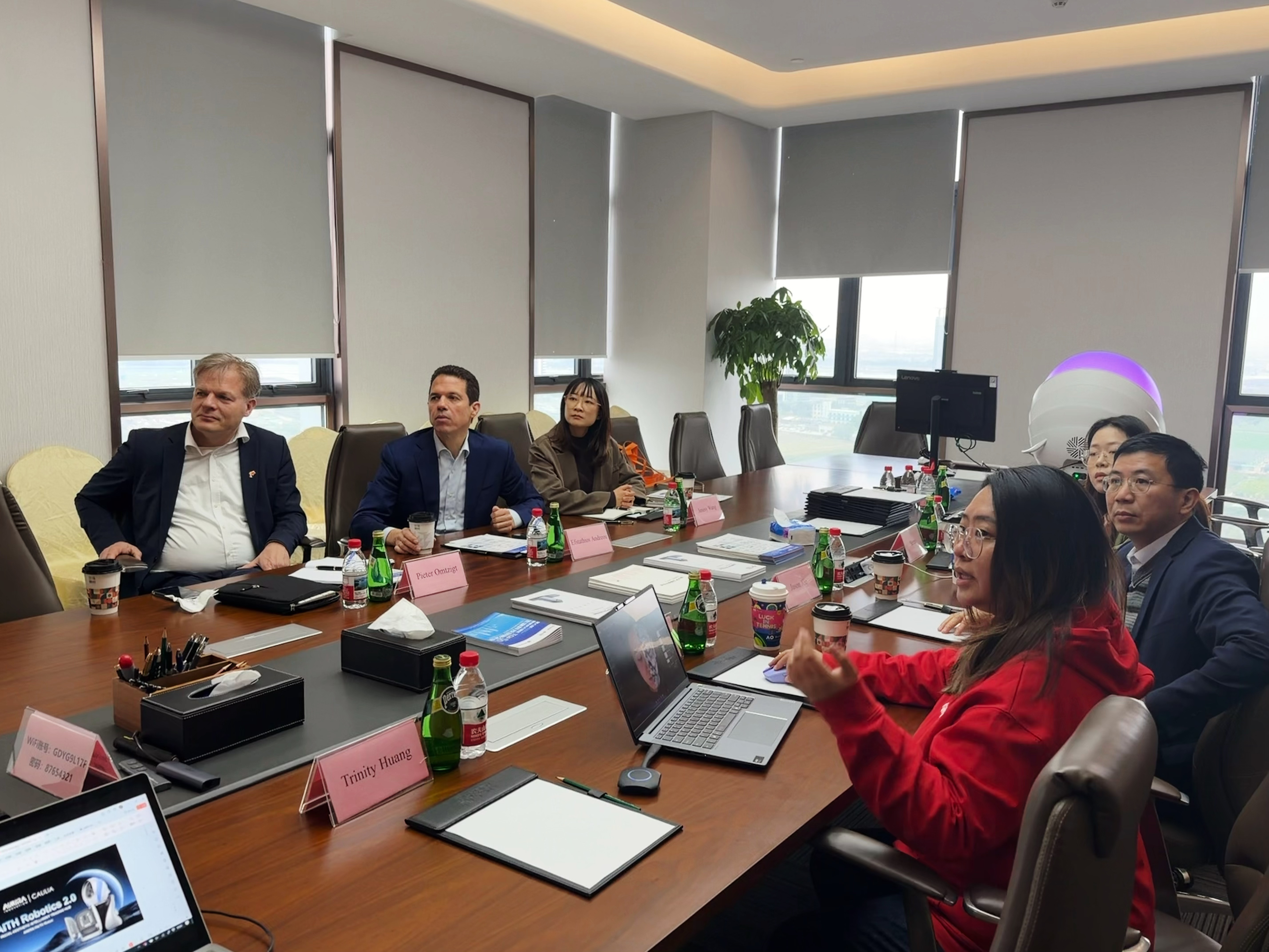 隨后,來(lái)賓一行與園區(qū)企業(yè)廣州美央科技進(jìn)行座談交流,由美央科技海外市場(chǎng)負(fù)責(zé)人莫舒韻及團(tuán)隊(duì)向代表團(tuán)介紹了公司的產(chǎn)品管線與研發(fā)進(jìn)展。作為英國(guó)CALILA醫(yī)療集團(tuán)旗下企業(yè),美央科技聚焦高端醫(yī)療機(jī)器人與精密儀器研發(fā),匯聚了來(lái)自全球頂尖院校的多學(xué)科專(zhuān)家團(tuán)隊(duì),涵蓋臨床醫(yī)學(xué)、航空航天、精密制造、人工智能及醫(yī)學(xué)圖像等領(lǐng)域,致力于以AI技術(shù)驅(qū)動(dòng)醫(yī)療機(jī)器人與智能硬件創(chuàng)新。