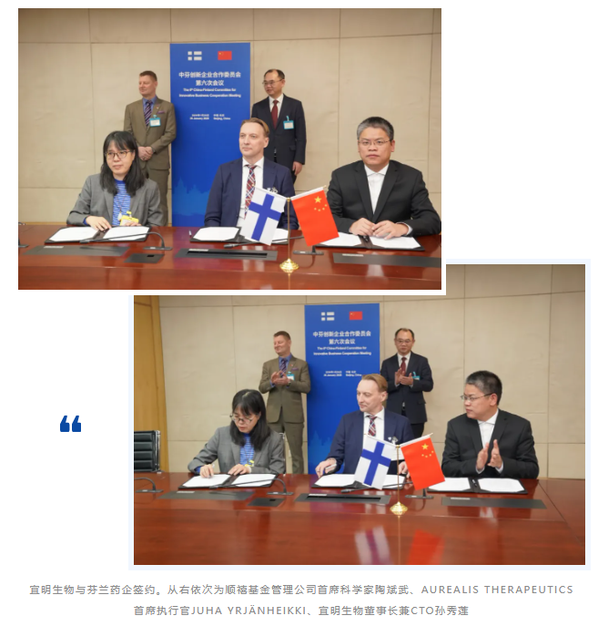 中芬創(chuàng)新企業(yè)合作委員會第六次會議在商務(wù)部舉行,政企各界圍繞創(chuàng)新領(lǐng)域合作展開深度探討并簽署多項(xiàng)商業(yè)協(xié)議。其中宜明生物董事長兼CTO孫秀蓮博士與芬蘭AUREALIS THERAPEUTICS首席執(zhí)行官JUHA YRJ?NHEIKKI先生等代表各方簽署協(xié)議,開展細(xì)胞與基因治療藥物項(xiàng)目(臨床三期以及工藝驗(yàn)證階段生產(chǎn)等)多邊合作。簽約儀式在中國機(jī)電商會副會長白雪峰與芬蘭駐華大使館公使銜參贊田馬可(Marko Tiesm?ki)共同見證下完成。