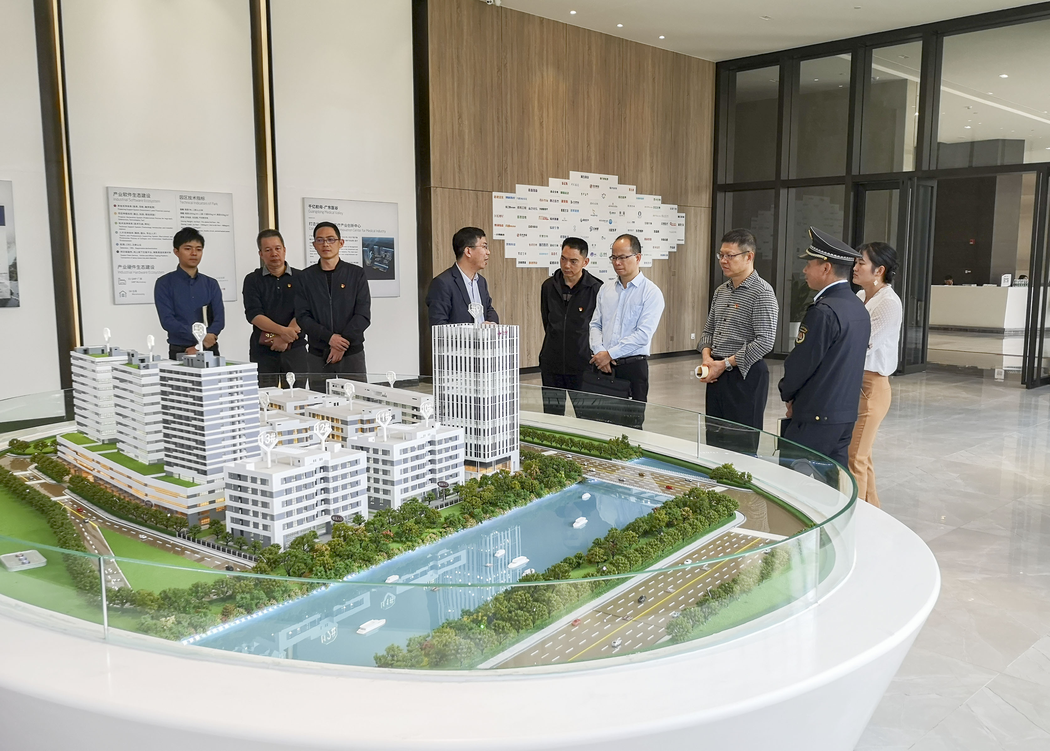 來賓們首先參觀了南沙園區(qū)一層大堂展廳,并詳細(xì)了解了園區(qū)招商進(jìn)展、園區(qū)的綜合服務(wù)、配套設(shè)施及未來發(fā)展計劃等情況。