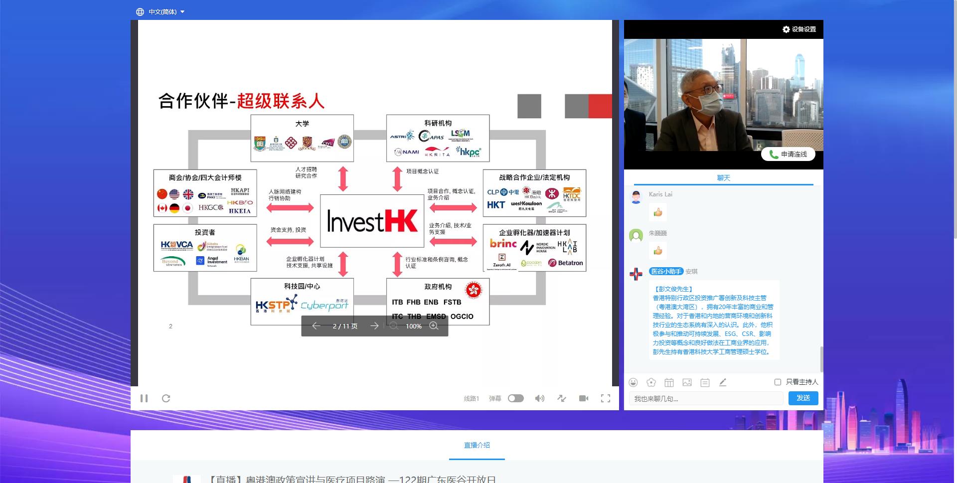 香港特別行政區(qū)投資推廣署創(chuàng)新及科技主管彭文俊作了“香港可創(chuàng)投資環(huán)境及商機(jī)的主題分享。香港擁有知名的跨國(guó)制藥公司進(jìn)駐,全球20大制藥公司已經(jīng)在香港設(shè)立公司,跨國(guó)制藥公司在香港進(jìn)行臨床試驗(yàn),匯聚產(chǎn)業(yè)政策、人才資源、研究能力等生物醫(yī)藥發(fā)展優(yōu)勢(shì)。香港政府于2018/2019香港財(cái)政預(yù)算案預(yù)留100億元支持在香港科學(xué)園建設(shè)醫(yī)療科技創(chuàng)新平臺(tái)和人工智能及機(jī)械人科技創(chuàng)新平臺(tái),旨在吸引世界頂級(jí)的科研機(jī)構(gòu)和科技企業(yè)來(lái)港,為香港匯聚及培育更多優(yōu)秀的科技人才,連同本地大學(xué)及科研機(jī)構(gòu)進(jìn)行更多研發(fā)合作項(xiàng)目。香港特別行政區(qū)投資推廣署是香港特別行政區(qū)的政府部門(mén)之一,一直積極鼓勵(lì)有意在香港設(shè)立公司或拓展業(yè)務(wù)的海外及內(nèi)地企業(yè)、中小型企業(yè)及跨國(guó)公司以香港作為業(yè)務(wù)發(fā)展的首要據(jù)點(diǎn)。投資推廣署的代表遍布全球多個(gè)重要的商業(yè)城市,確保為投資者提供快速便捷、完善可靠的服務(wù)。