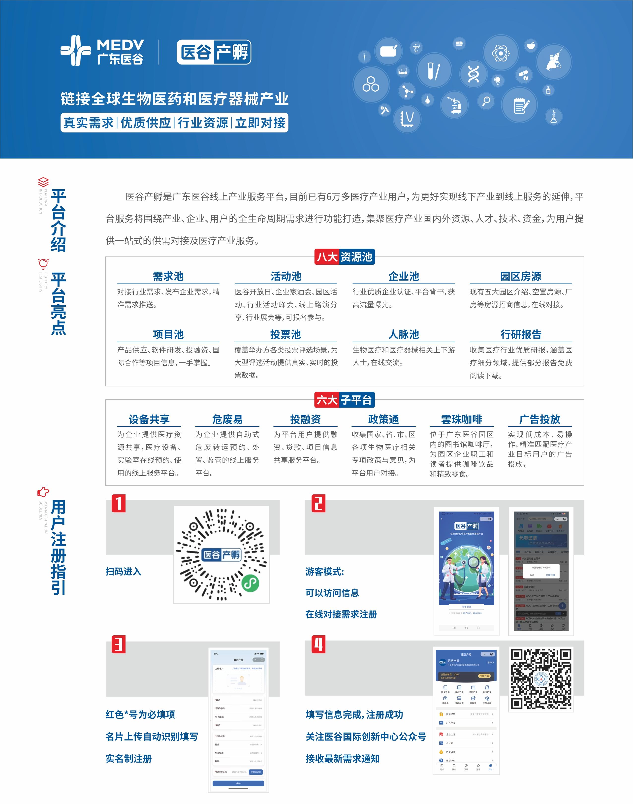 為更好實(shí)現(xiàn)線下產(chǎn)業(yè)到線上服務(wù)的延伸,廣東醫(yī)谷自主開發(fā)“醫(yī)谷產(chǎn)孵”產(chǎn)業(yè)服務(wù)平臺,平臺服務(wù)將圍繞產(chǎn)業(yè)、企業(yè)、用戶的全生命周期需求進(jìn)行功能打造,積累需求、項(xiàng)目、人脈、企業(yè)、活動五大資源池,集聚醫(yī)療產(chǎn)業(yè)國內(nèi)外資源、人才、技術(shù)、資金,為用戶提供一站式的供需對接及醫(yī)療產(chǎn)業(yè)服務(wù),目前已有6萬多醫(yī)療產(chǎn)業(yè)用戶。
